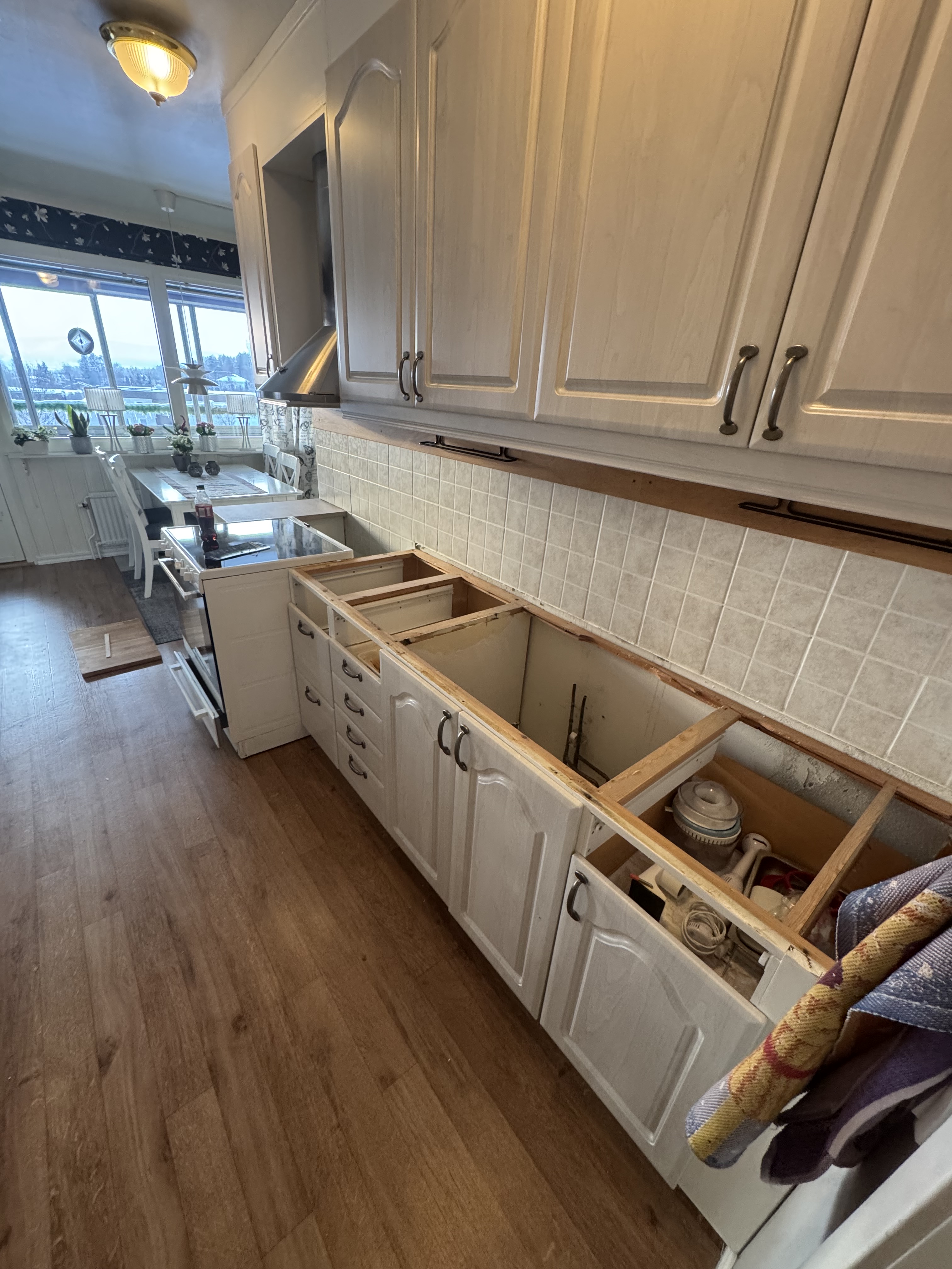 Den gamla bänkskivan är demonterad och köksstommarna förberedda inför montering av ny bänkskiva.